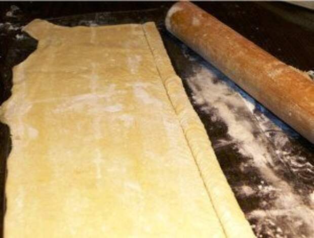 Тесто раскатываем до толщины 2-3 мм, разрезаем на полоски шириной 1,5 см (при «отрывании» от поверхности они немного вытянутся и станут желаемой ширины примерно в 1 см):