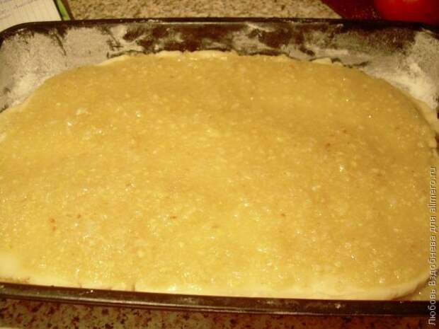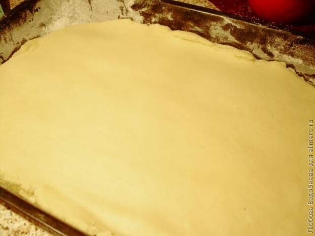 Противень средней величины посыпем мукой. Достаем тесто из холодильника и одну его часть тонко раскатываем. Пласт должен заполнить собой противень