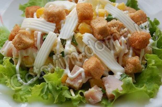 Подавать, выложив на листья салата, посыпав оставшимися сухариками.