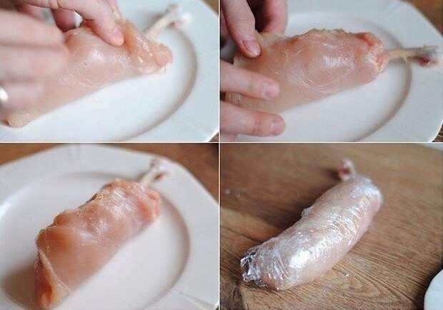 7. Сформированную котлету плотно заворачиваем в пищевую пленку и отправляем в морозильник на 20 минут.