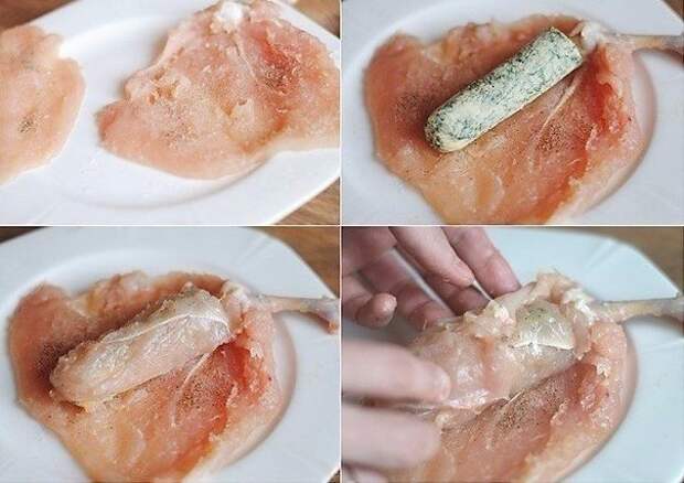 6. Филе солим и перчим. Достаем масло, разрезаем напополам и выкладываем по половинке на каждое большое филе. Накрываем сверху малым филе и плотно заворачиваем в большое, формируя продолговатую котлету. Важно, чтобы не было никаких просветов, иначе масло при жарке будет вытекать.