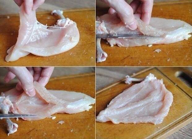 3. Отделяем малое филе от большого и откладываем пока в сторону (каждая куриная грудка имеет небольшой кусочек филе, вот его и отрезаем).