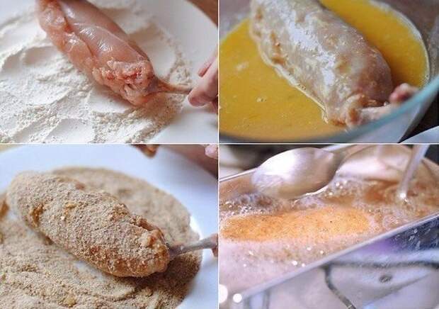 8. Достаем котлеты и обмакиваем сначала в муку, потом во взбитые с молоком яйца, и, наконец, в панировочные сухари. Затем еще раз обмакиваем в кляре и сухарях (двойная панировка также нужна для того, чтобы образовалась прочная корочка и масло не могло вытечь).