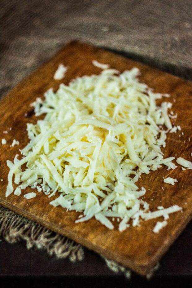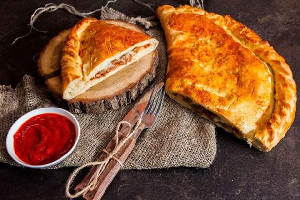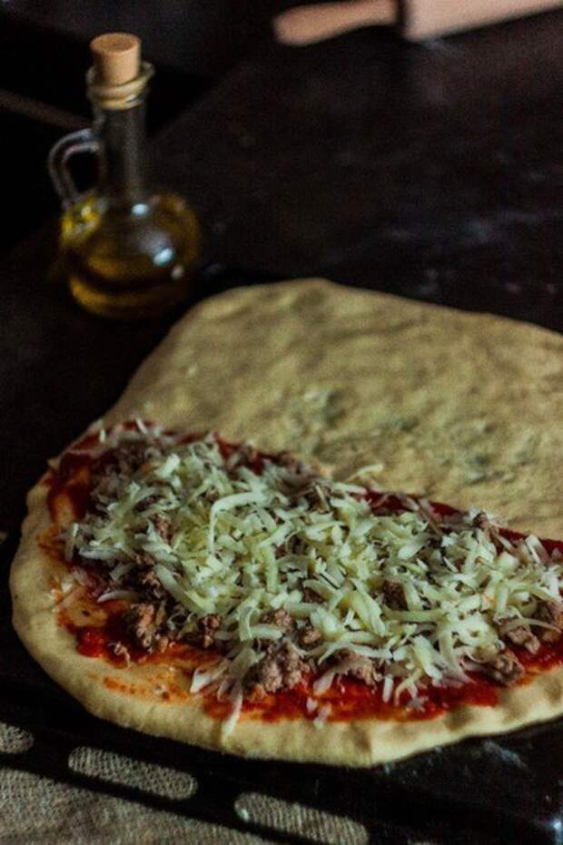 5. Переверните противень и подпылите мукой. Растяните руками тесто в тонкий пласт. Одну половину пласта смажьте соусом. Распределите фарш и посыпьте тертой моцареллой. Накройте второй половиной и тщательно защипните края.