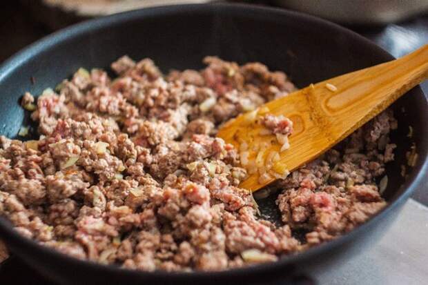 4. Обжарьте лук с фаршем и специями почти до готовности.