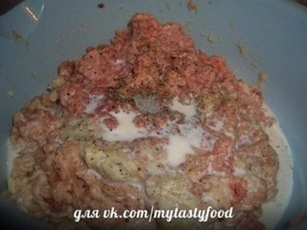 Для начала замочим в молоке хлеб. Прокрутим через мясорубку мясо, лук, замоченный хлеб . Добавим соль, перец, молоко и вымесим фарш.