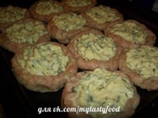 Из фарша (руки смачивать водой) сформовать колобок, после придать форму "Гнезда" и выложить на смазанное сливочным маслом дно мультиварки (или на противень). В углубление разложить наполнитель (сначала положить по 1 ст. ложке, а остатки разложить после). Включить мультиварку на режим выпечка и поставить запекаться "гнезда" до зарумянивания, примерное время 25 минут. ( По желанию перевернуть).