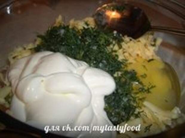 Сыр натереть на крупной терке, смешать с яйцами, сметаной и укропом.