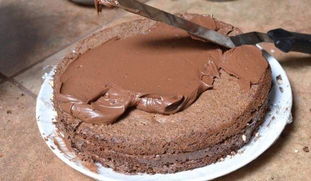 Испеченный корж разжьте вдоль на 2-3 слоя. Вафли накрошите.