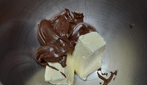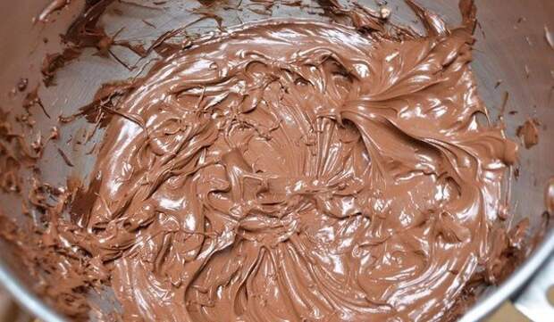 Растопите шоколад в микроволновке или на водяной бане. Затем полностью остудите шоколад до комнатной температуры. Смешайте шоколад с предварительно взбитыми отдельно маслом и нутеллой. Все взбейте вместе до однородной массы.