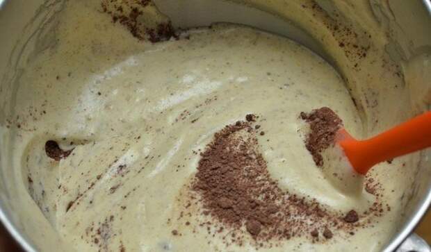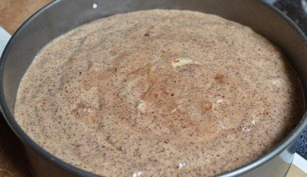Муку, какао и разрыхлитель смешайте. Добавьте накрошенные орехи. в 3 подхода постепенно добавьте сухую смесь к яичной. Форму для торта смажьте сливочным маслом и вылейте туда тесто. Выпекайте при 175 градусах около 40 минут.