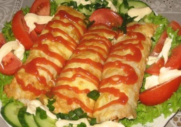 7.Готовый блин выкладываем на тарелку яйцом вниз, а фаршем вверх. Смазываем приготовленным майонезом, посыпаем сыром и выкладываем помидоры. Сворачиваем аккуратно рулетом. Увлеклась и забыла сфотографировать этот процесс. Начинкой в бризоль часто берут свежие и маринованные огурцы, жареные грибы.