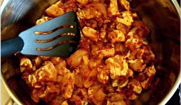 9. Порезать курицу на кубики размером 2,5 см и добавить в зажарку.