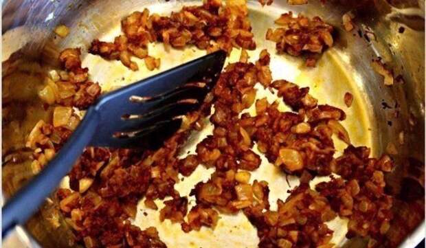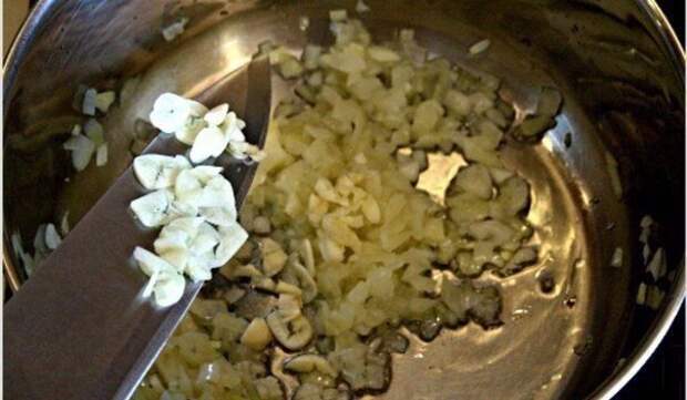 5. Добавить чеснок к луку и обжарить их до мягкого состояния.