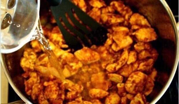 11. Залить курицу водой, посолить, закрыть крышкой и, периодически помешивая, варить 20–25 минут.