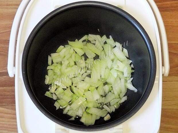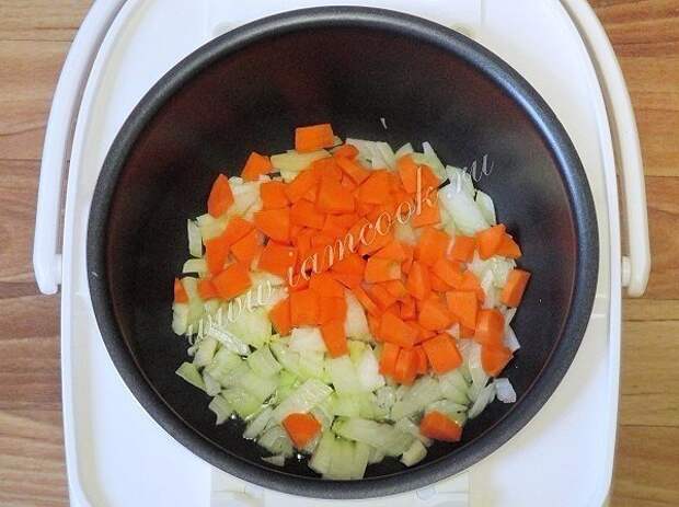 Первым делом установите режим "жарка" или "выпечка" и в течении 20 минут друг за другом добавляйте ингредиенты: сначала слегка минуты 2-3 обжарьте нарезанный лук, слегка посолите его, затем добавьте морковь, нарезанную кубиками, минуты через три закидывайте кусочки мяса, перемешайте и пожарьте все вместе минут 5, т.е. чтобы мясо "схватилось" / "запечаталось".