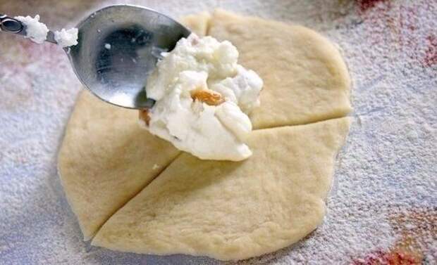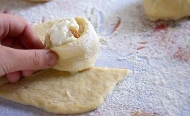 7. Одну из трёх частей (самую маленькую) оборачиваем вокруг творога и скрепляем.