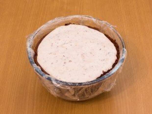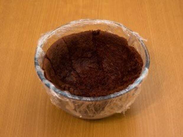 5. Выложить крем в миску с коржом. Накрыть вырезанным кругом. Убрать в холодильник (не морозилку) на 6-8 часов.
