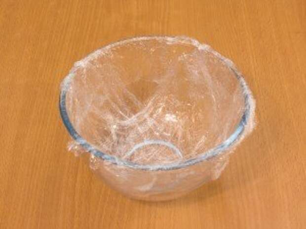 3. Из коржа вырезать круг, используя в качестве трафарета миску емкостью около 1,2 л. Круг убрать в сторону. Миску застелить пищевой пленкой. Из оставшегося коржа вырезать треугольники, выложить их в миску, повторяя ее форму.