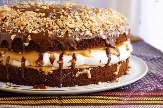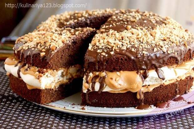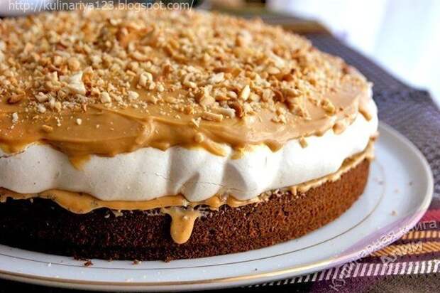 Накрыть коржом-безе, также смазать кремом и обсыпать орехами.