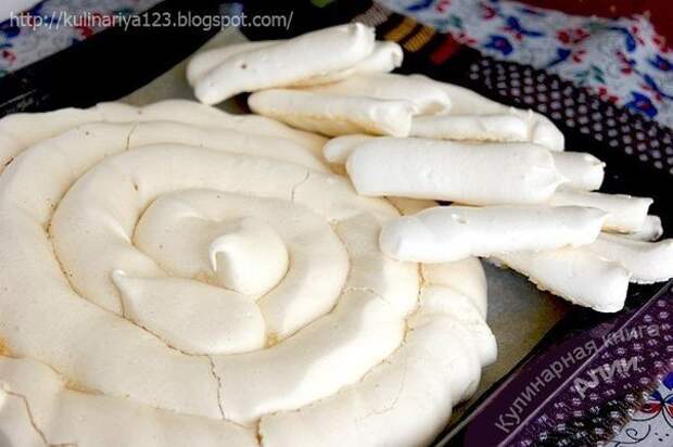7 белков я взбила с 400 г сахара, сделала один корж диаметром 26 см (на бумаге я начертила круг диаметром 24 см, а корж потом расплылся до 26 см), а из оставшегося безе еще палочек насушила. Думаю, корж из 3-4 белков будет нормальный (на 1 белок - 60 г сахара)
