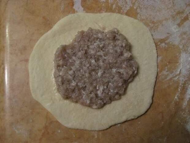 Раскатываем шарики в блин размером с блюдце. В центр кладем столовую ложку начинки, слегка разравниваем ее.