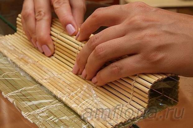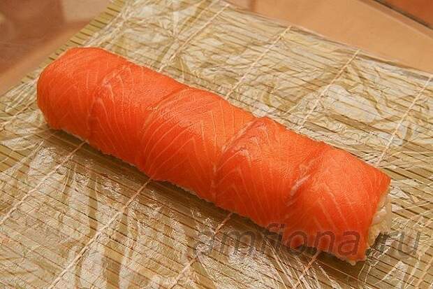 Еще раз накройте ролл ковриком и прижмите рыбу.