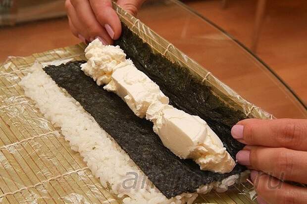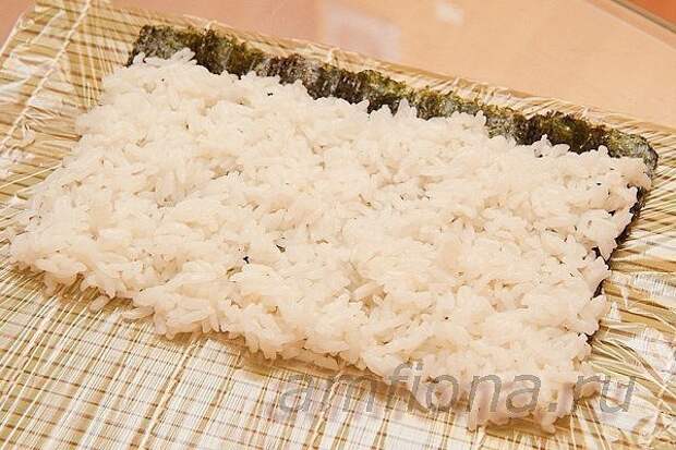 Оберните макису пищевой плёнкой,сверху половину листа нори.Распределите рис, смачивая ладонь водой. Оставьте свободной небольшую полосу на ближнем к вам крае нори и сделайте смещение на дальнем. Спрессовывать рис не нужно.