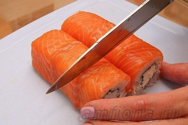 Перенесите ролл на разделочную доску и острым ножом, смоченным водой, разрежьте его пополам.Затем каждую половину — на три или четыре кусочка.