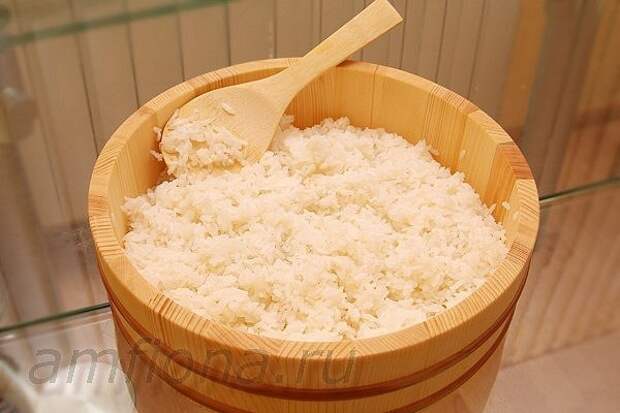 Рис хорошо промойте, положите в кастрюлю, налейте воды из расчёта 1:1,2. Доведите до кипения, уменьшите огонь и варите рис около 15 минут, не снимая крышки. После дайте рису постоять минут 10, переложите и заправьте рисовым уксусом