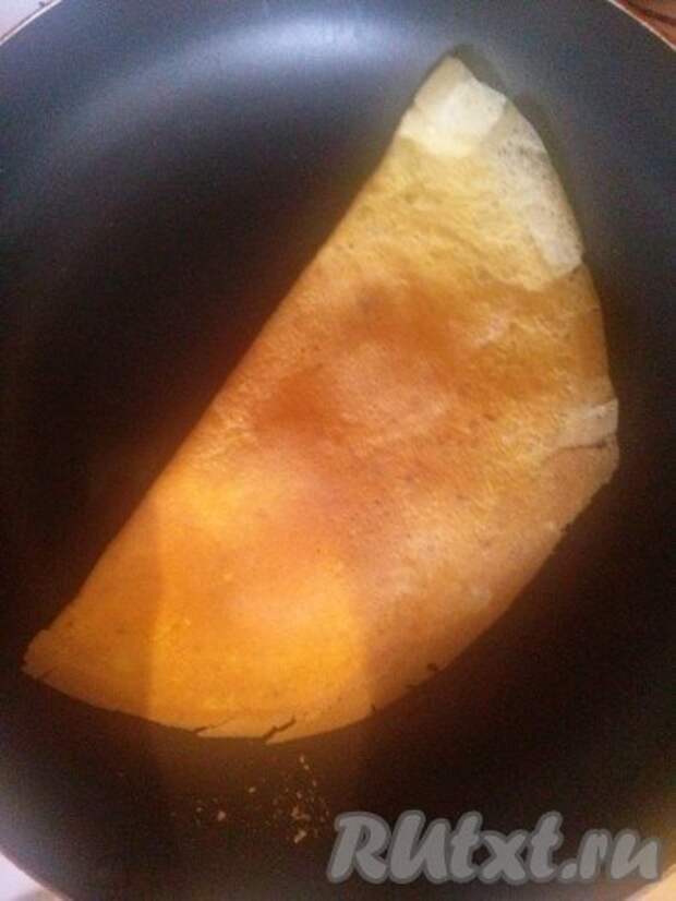 Шаг 4. Когда яичный лист немного подсушится, высыпаем начинку на одну сторону, сначала колбасу, потом лук, сверху сыр, другой стороной накрываем. Переворачиваем наш омлет на обратную сторону, чтобы расплавился сыр и омлет "склеился". Готовим до золотистого цвета.