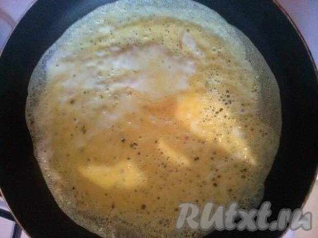 Шаг 3. Взбитое яйцо выливаем на сковороду и распределяем по всей поверхности так, чтобы толщина листа была, как толстый блинчик. Накрываем крышкой и убавляем огонь.