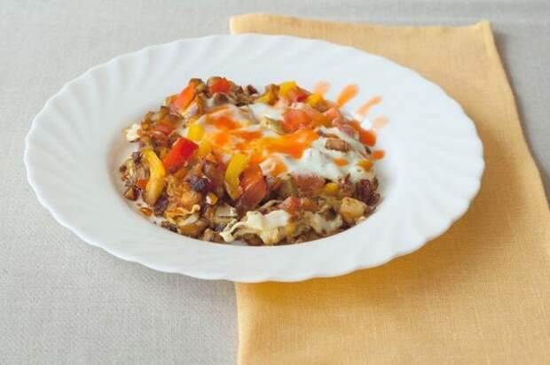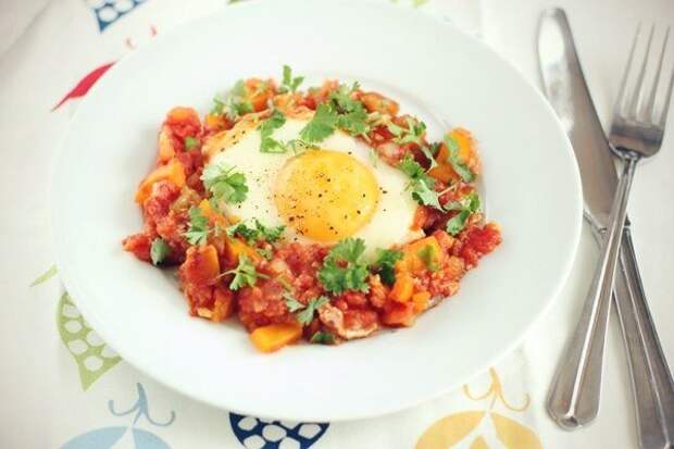 5. Готовьте на небольшом огне до тех пор, пока яйца не будут готовы (степень прожарки выбирайте на свое усмотрение). Каждое яйцо немного посолите и посыпьте свежемолотым черным перцем. Подавайте, посыпав рубленой петрушкой.
