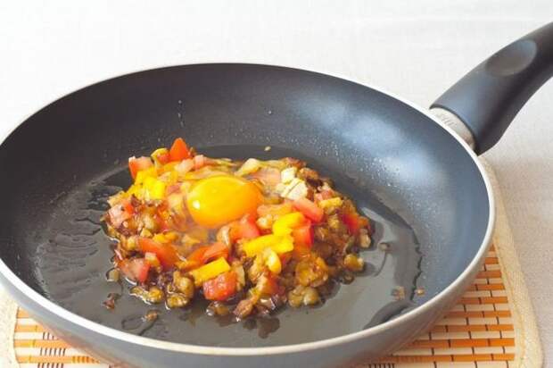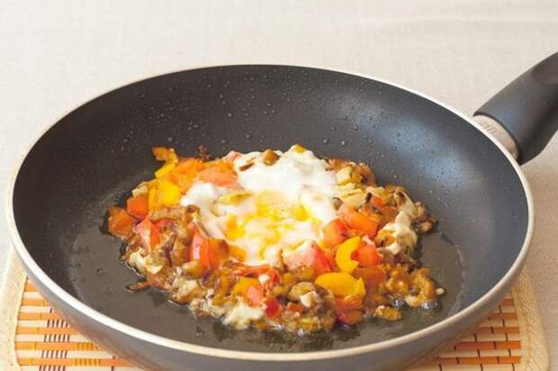 4. Посолите, добавьте специи. Когда смесь закипит, сделайте в ней 4 углубления и в каждое аккуратно вылейте по одному яйцу.