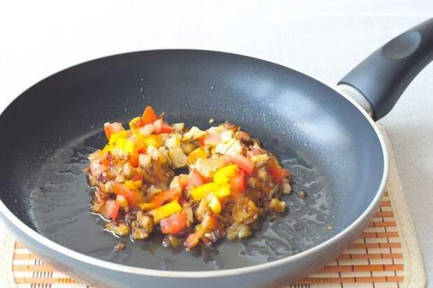 3. Когда перец станет мягким, добавьте измельченный чеснок. Помидоры очистите от кожицы, предварительно опустив в кипяток на 30 секунд, нарежьте кубиками и добавьте в сковороду.
