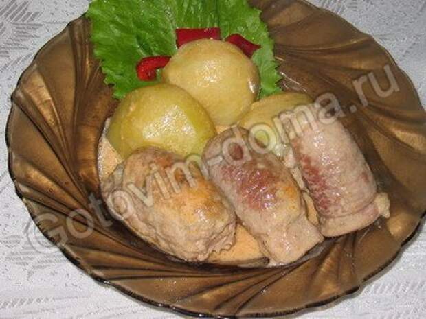 Обжаренные рулетики выложить в утятницу или сковороду и залить соусом (соус должен покрывать рулетики). Если полученного соуса недостаточно, можно добавить немного воды или бульона.