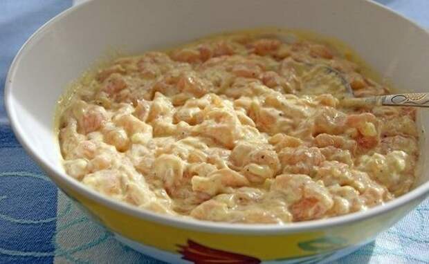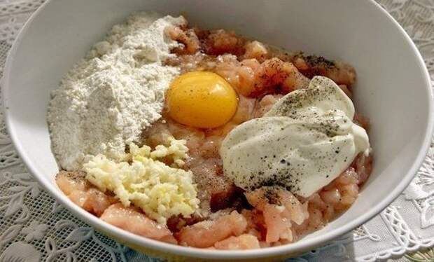 добавить майонез, яйцо, муку, соль, перец, выдавить чесночка.