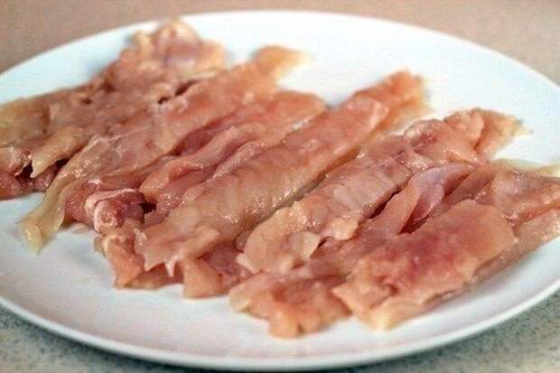 2. Разрежьте отбитую грудку на тонкие полоски равной ширины. И оставьте ненадолго на тарелке, присыпав немного солью.