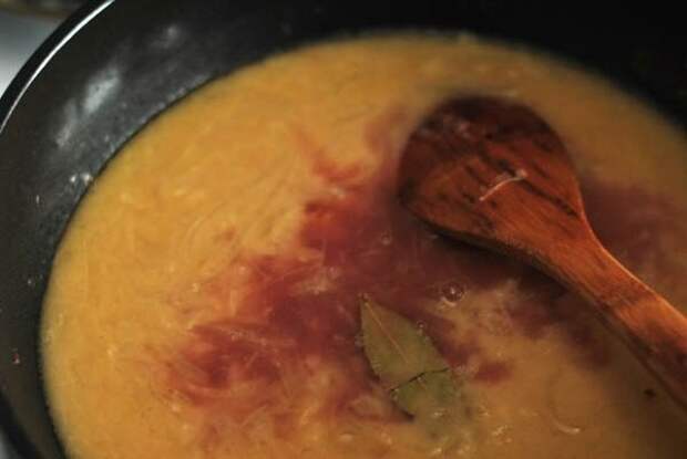 5. Вливаем в сковороду бульон, вино, добавляем лавровый листик, доводим до кипения и варим при закрытой крышке еще минут 20.