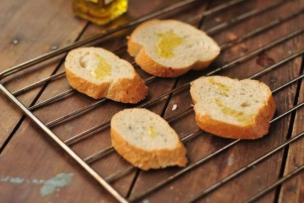 7. Следующий шаг − чистой воды французские заморочки. Багет нарежьте полейте оливковым маслом и подсушите в духовке или на сковороде.