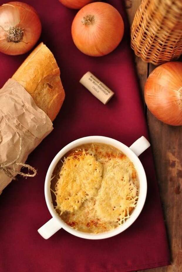 9. И запеките в разогретой духовке до румяной сырной корочки. Для этого лучше включить только верхний нагрев или гриль. Подавайте горячим. Если вы не сильно зажарите лук, суп будет мягким по вкусу, с легкой винной кислинкой.