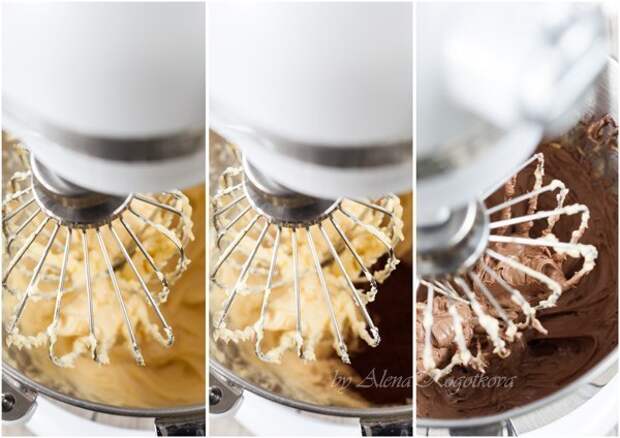 Постепенно (в 2-3 захода) ввести желтковую массу, не прекращая взбивать (2-4 скорость).