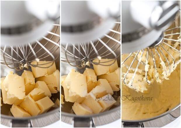 2. Масло нарезать кубиками. Взбить с экстрактом ванили до пышности (у меня 2-4 скорость, 1 минута).