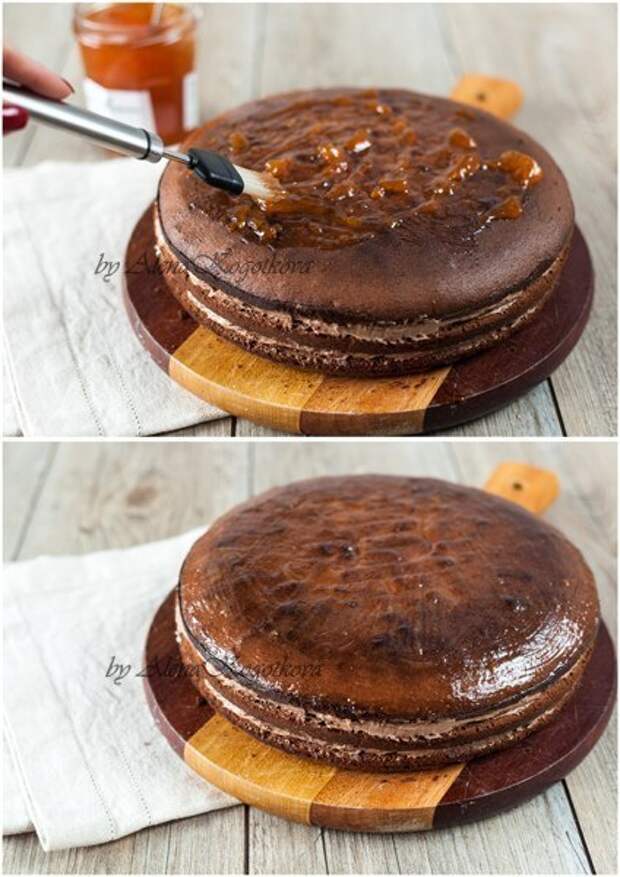 3. Промазать торт снаружи джемом. Убрать на пару часов в холодильник, чтобы джем застыл.