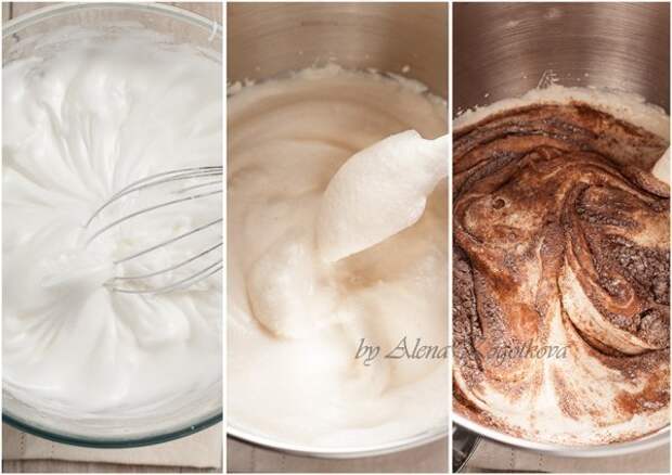 2. Белки взбить до пены (4-6 скорость, 2 минуты), постепенно всыпая сахар, взбить до средних пиков (6-8 скорость 1-2 минуты).