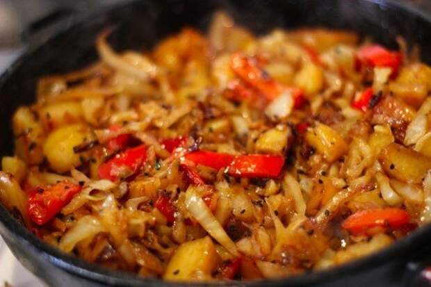 5. Тушите с закрытой крышкой. За 5 минут до готовности добавьте нарезанный соломкой болгарский перец и соль.