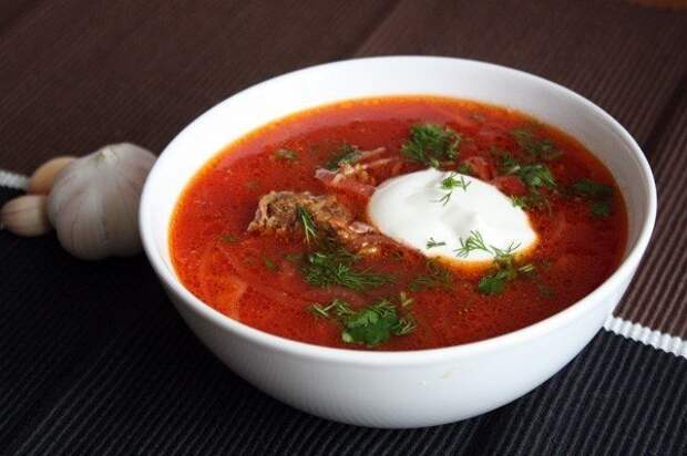9. При подаче на стол в борщ добавляют сметану и зелень. Отлично подходит к борщу чеснок и черный хлеб.