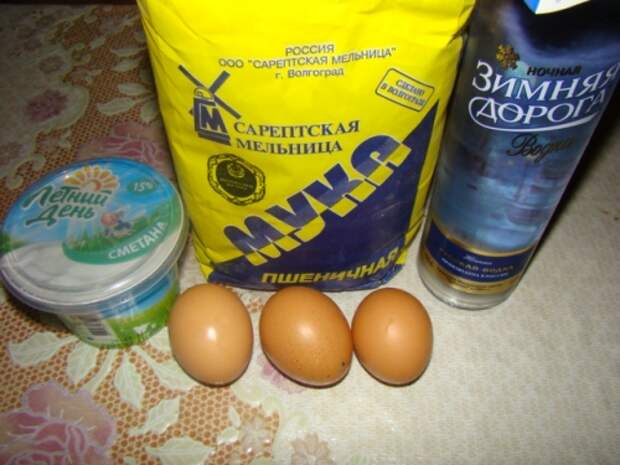 На одну порцию берем одно яйцо, 1 ст.ложку сметаны и 1ст.ложку водки.Муки подмешиваем столько, сколько возьмет тесто.Я делаю тесто не слишком крутое.Оно должно чуть-чуть расплываться на поверхности.