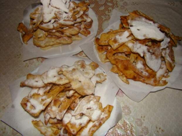 Не страшно если порвется, нам его все равно нарезать.Обжариваем на растительном масле, на среднем огне.А затем посыпаем обильно сахарной пудрой.Вот сколько хвороста у меня получилось из тройной нормы.