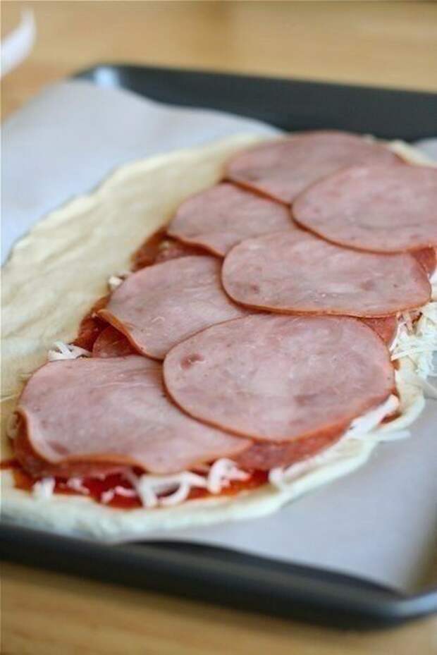 Чтобы приготовить тесто, нужно смешать стакан теплой воды с дрожжами и чайной ложкой сахара. Теперь в эту смесь нужно добавить две ч.л. соли и две ст.л. оливкового масла. Замесить тесто в комбайне, вымешивать минут 15-20, после чего положить в миску с небольшим количеством растительного масла, накрыть полотенцем и оставить в таком положении подходить на час или полтора. Когда тесто подошло, взять половину и раскатать из него пласт размером 25 на 40. Выложить томатный соус, оставляя с краев 6-7 см со всех сторон. На помидоры положить тертый сыр моцареллу, разложить кусочки ветчины и салями, взять яйцо, слегка его взбить, чтобы смазать незаполненные края. Завернуть узкие края теста, завернуть всё это в рулет и перенести на противень. Смазать поверхность рулета яйцом, посыпать оставшимся сыром, сделать на рулете поперечные разрезы через 4-5 см. Последний штрих - это сухая травка или это петрушка может быть, или орегано. Выпекается стромболи в духовке при температуре 250-240 градусов в течение 10-12 минут.